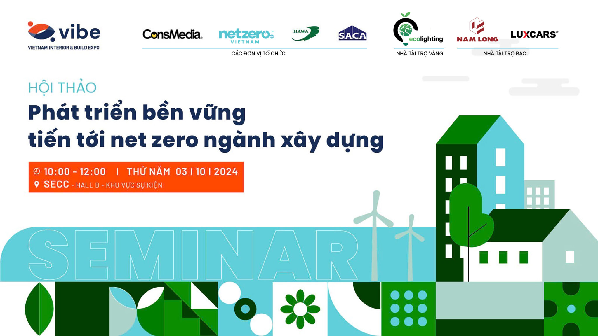 Within the framework of the Interior & Construction Exhibition – VIBE 2024, which will take place from October 2 to October 5 at the SECC Exhibition and Convention Center (799 Nguyễn Văn Linh, Tân Phú Ward, District 7, Ho Chi Minh City), the Organizing Committee, in collaboration with ConsMedia Construction Communications JSC and Net Zero Vietnam JSC (NetZero.VN), will host the seminar “Sustainable Development – Advancing Toward Net Zero in the Construction Industry.”