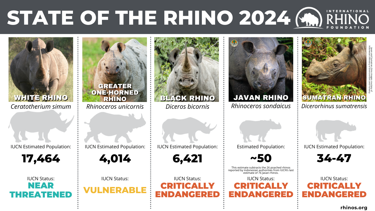 Theo báo cáo đặc biệt mang tên Tình hình tê giác do Quỹ Tê giác quốc tế (IRF) công bố, thế giới hiện chỉ còn 5 loài tê giác; 3 trong số 5 loài này đang bị đe dọa tuyệt chủng ở mức cực kỳ nguy cấp. Tổng cả 5 loài cộng lại cũng chưa tới 28.000 con.